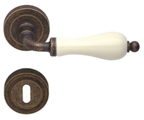 Porcelánbetétes ajtókilincs, sárgaréz öntvény rozettán, patinás antik felületkezeléssel. Toalettzáras és bejárati verzió is rendelhető!