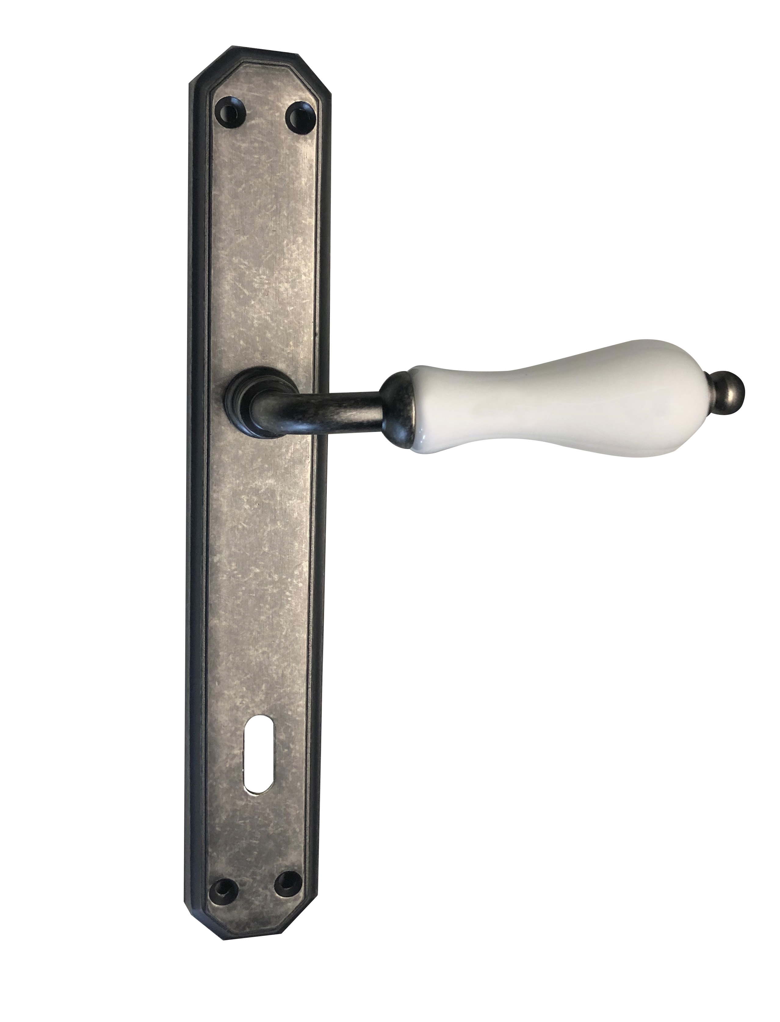 Fehér porcelánbetétes ajtókilins, cod. 12 öntvény pajzson, ARG ANT / ezüst antik felülettel. Virágos és csontszín porcelánbetéttel is rendelhető!